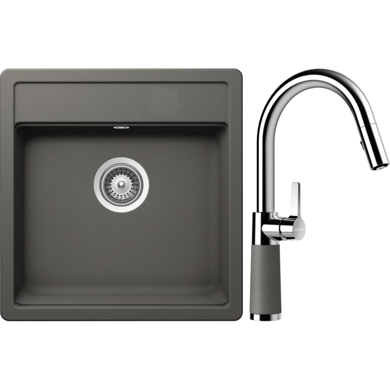 Cenově zvýhodněný set dřezu a baterie Schock S10-7 - obsahuje granitový jednodřez Mono N-100S Silverstone a baterii se sprchou SC-520.120 Silverstone.