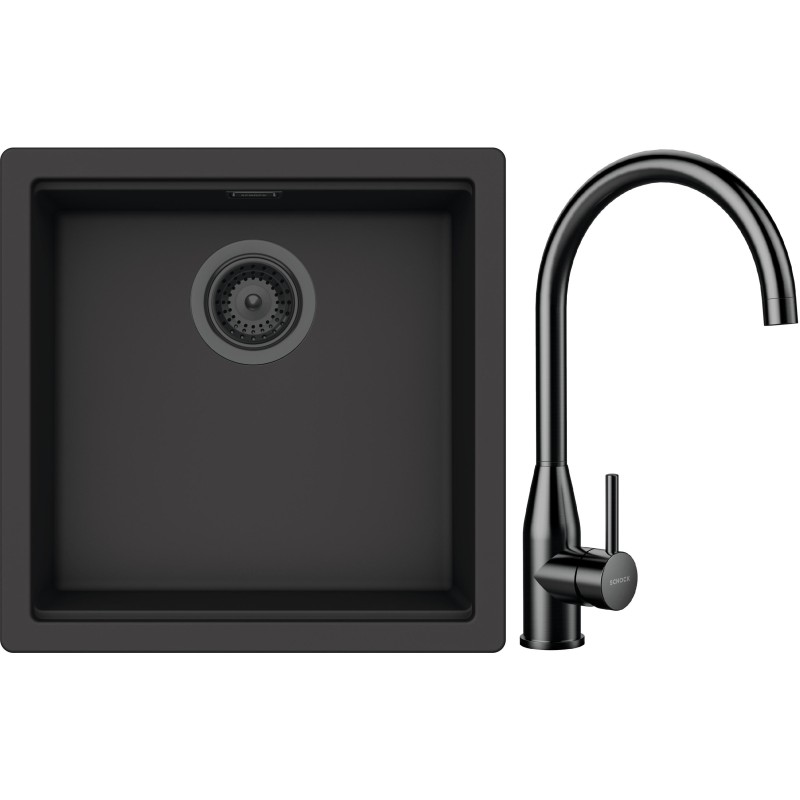 Cenově zvýhodněný set dřezu a baterie Schock S31-5 - obsahuje granitový jednodřez Kiruna N-100 Dusk, baterii Kavus Gunmetal brushed a části dřezu v provedení Gunmetal brushed.