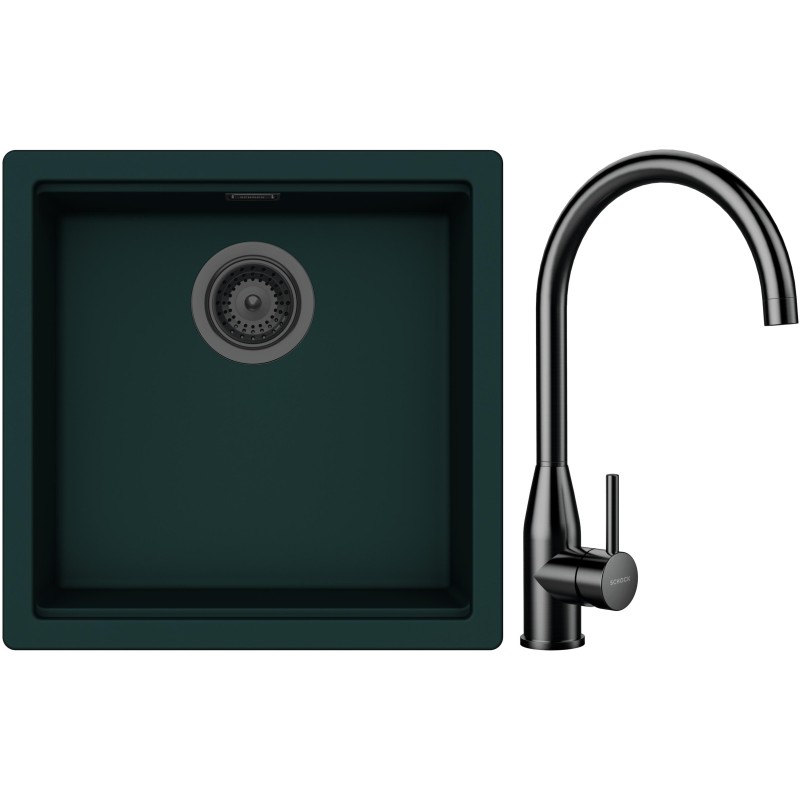 Cenově zvýhodněný set dřezu a baterie Schock S31-5 - obsahuje granitový jednodřez Kiruna N-100 Ivy, baterii Kavus Gunmetal brushed a části dřezu v provedení Gunmetal brushed.
