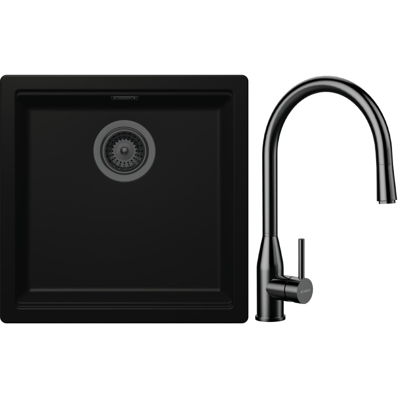 Cenově zvýhodněný set dřezu a baterie Schock S31-10 - obsahuje granitový jednodřez Kiruna N-100 Night, baterii s vytahovací koncovkou Kavus.120 Gunmetal brushed a části dřezu v provedení Gunmetal brushed.