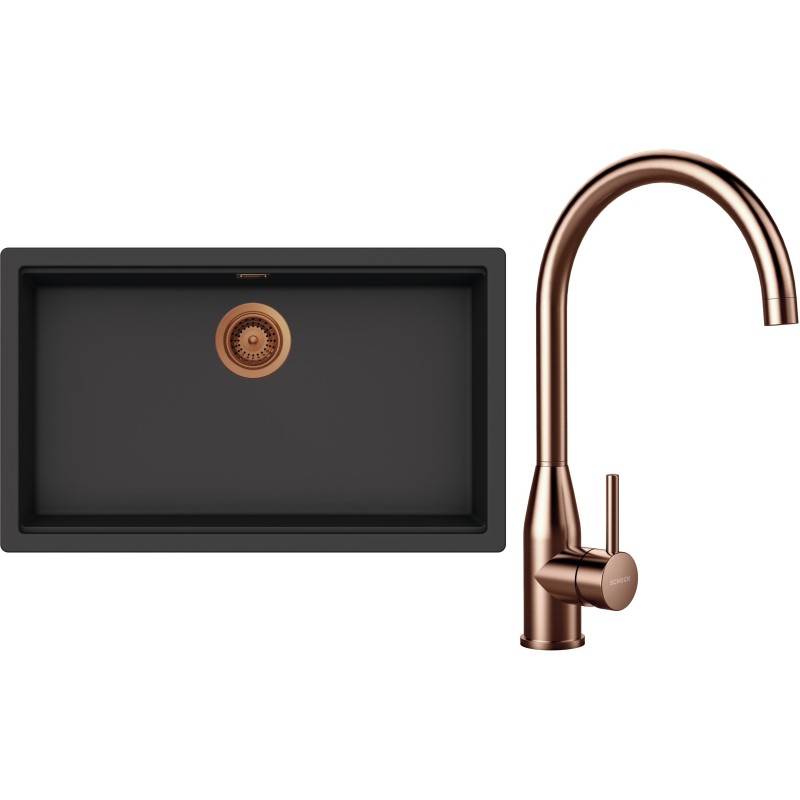 Cenově zvýhodněný set dřezu a baterie Schock S33-4 - obsahuje granitový jednodřez Kiruna N-100XL Dusk, baterii Kavus Copper brushed a části dřezu v provedení Copper brushed.