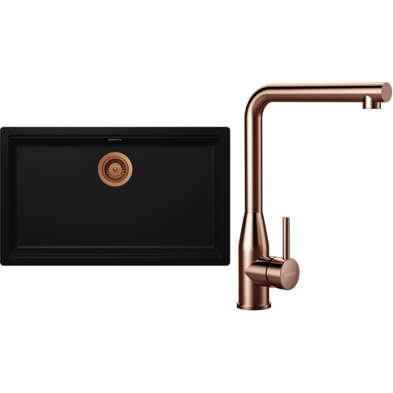 Cenově zvýhodněný set dřezu a baterie Schock S33-14 - obsahuje granitový jednodřez Kiruna N-100XL Night, baterii Keto Copper brushed a části dřezu v provedení Copper brushed.