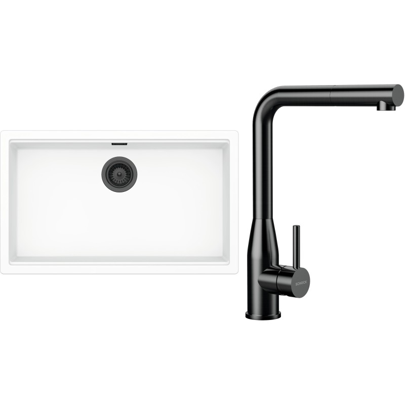 Cenově zvýhodněný set dřezu a baterie Schock S33-20 - obsahuje granitový jednodřez Kiruna N-100XL Day, baterii s vytahovací koncovkou Keto.120 Gunmetal brushed a části dřezu v provedení Gunmetal brushed.