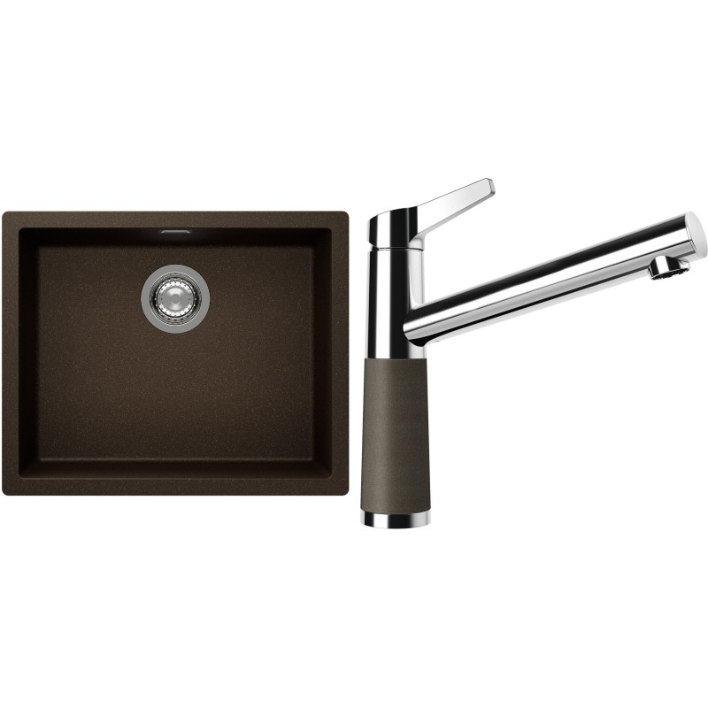 Cenově zvýhodněný set dřezu a baterie Schock S14-4 - obsahuje granitový jednodřez Kaia N-100L Bronze a baterii SC-510 Bronze.