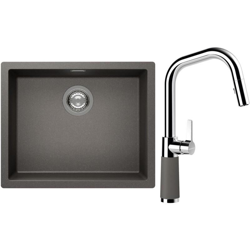 Cenově zvýhodněný set dřezu a baterie Schock S14-9 - obsahuje granitový jednodřez Kaia N-100L Silverstone a baterii se sprchou SC-530.120 Silverstone.