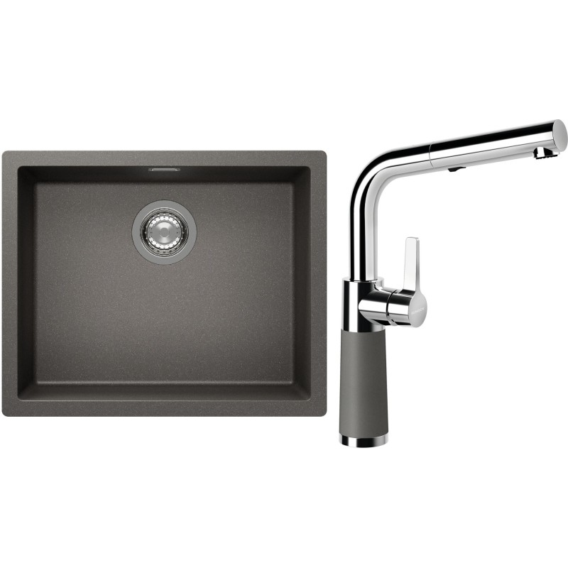 Cenově zvýhodněný set dřezu a baterie Schock S14-11 - obsahuje granitový jednodřez Kaia N-100L Silverstone a baterii se sprchou SC-540.120 Silverstone.