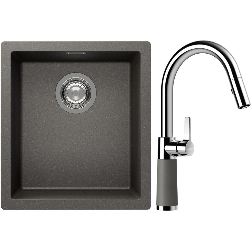 Cenově zvýhodněný set dřezu a baterie Schock S12-7 - obsahuje granitový jednodřez Kaia N-100S Silverstone a baterii se sprchou SC-520.120 Silverstone.