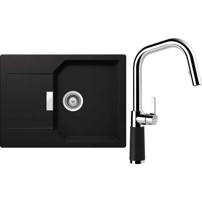 Cenově zvýhodněný set dřezu a baterie Schock S19-11 - obsahuje granitový dřez s odkapem Manhattan D-100S Nero a baterii se sprchou SC-530.120 Nero.