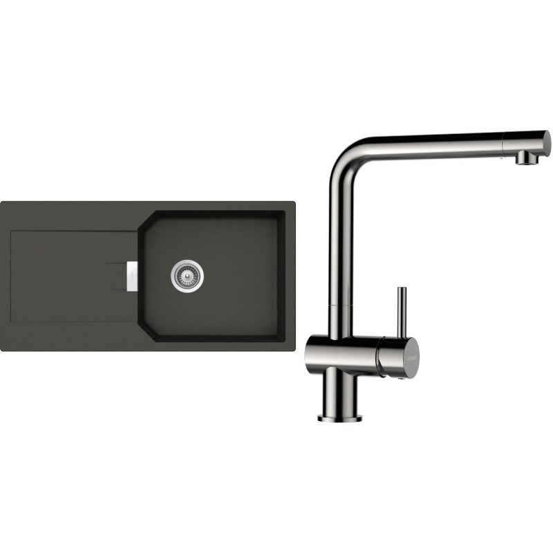 Cenově zvýhodněný set dřezu a baterie Schock S21-5 - obsahuje granitový dřez s odkapem Manhattan D-100L Asphalt a baterii Epos Nerezový vzhled.
