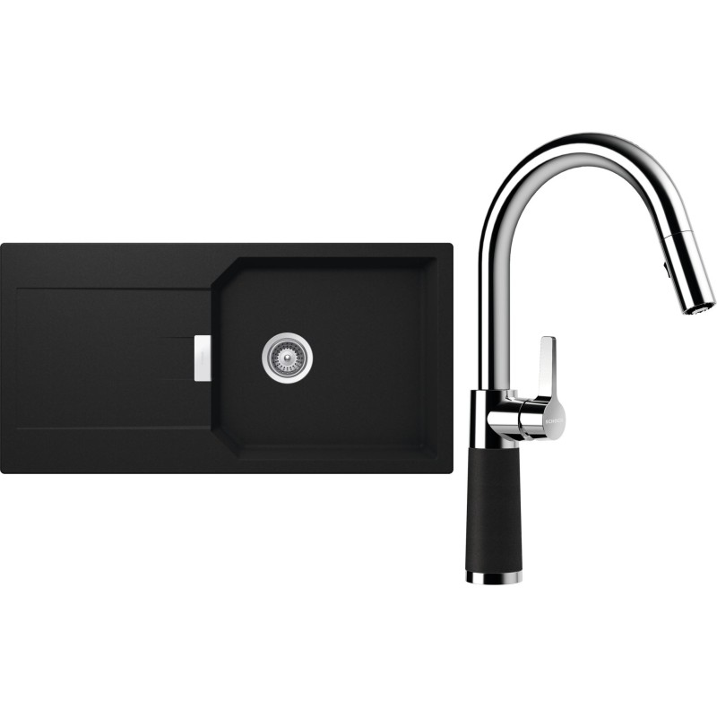 Cenově zvýhodněný set dřezu a baterie Schock S21-9 - obsahuje granitový dřez s odkapem Manhattan D-100L Onyx a baterii se sprchou SC-520.120 Onyx.