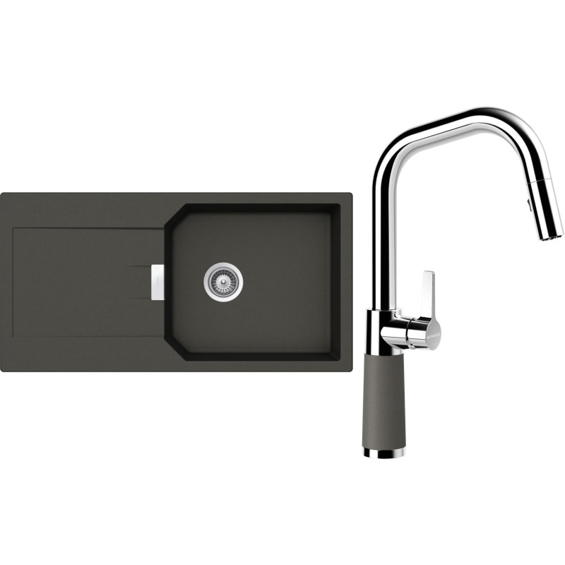 Cenově zvýhodněný set dřezu a baterie Schock S21-11 - obsahuje granitový dřez s odkapem Manhattan D-100L Asphalt a baterii se sprchou SC-530.120 Asphalt.