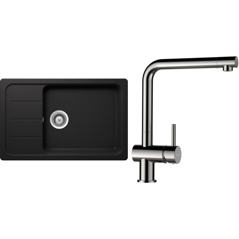 Cenově zvýhodněný set dřezu a baterie Schock S27-5 - obsahuje granitový dřez s odkapem Formhaus D-100LS Nero a baterii Epos Nerezový vzhled.