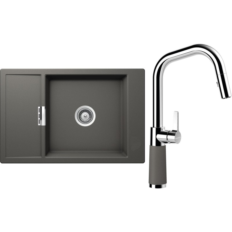 Cenově zvýhodněný set dřezu a baterie Schock S4-9 - obsahuje granitový dřez s odkapem Mono D-100XS Silverstone a baterii se sprchou SC-530.120 Silverstone.