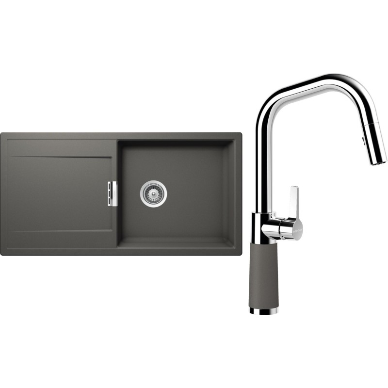 Cenově zvýhodněný set dřezu a baterie Schock S8-9 - obsahuje granitový dřez s odkapem Mono D-100L Silverstone a baterii se sprchou SC-530.120 Silverstone.
