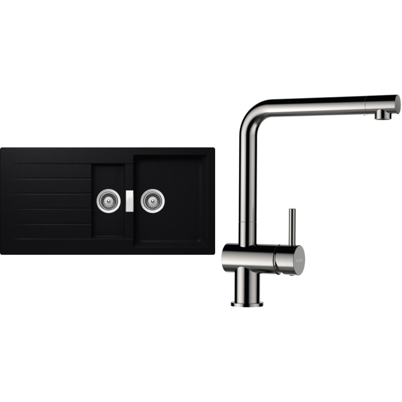 Cenově zvýhodněný set dřezu a baterie Schock S3-3 - obsahuje granitový dřez s vaničkou a odkapem Signus D-150 Puro a baterii Epos Nerezový vzhled.