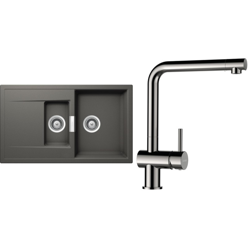 Cenově zvýhodněný set dřezu a baterie Schock S7-3 - obsahuje granitový dřez s vaničkou a odkapem Mono D-150 Silverstone a baterii Epos Nerezový vzhled.