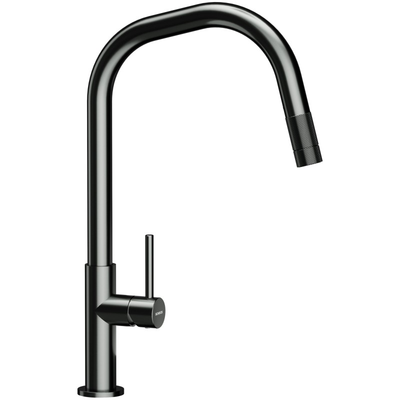 Stojánková dřezová baterie, provedení Gunmetal brushed, výška 383 mm, vytahovací koncovka s přepínačem na sprchu, pro otvor 35 mm, otočná o 360 °.